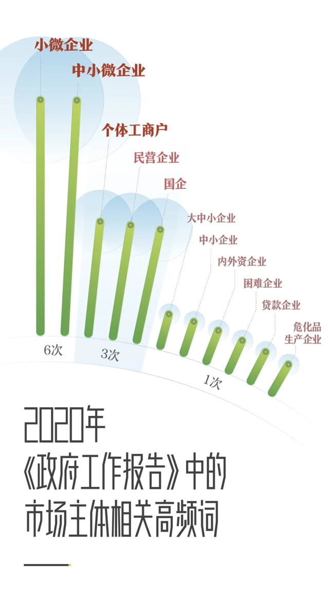 在今年的報告中,跟市場(chǎng)主體相關(guān)的詞里,“小微企業(yè)”提及次數最多,總計12次。其中6次為單獨提及,還有6次是列入“中小微企業(yè)”一詞中。足以證明對“小微企業(yè)”這一就業(yè)主要“容納器”的重視。
