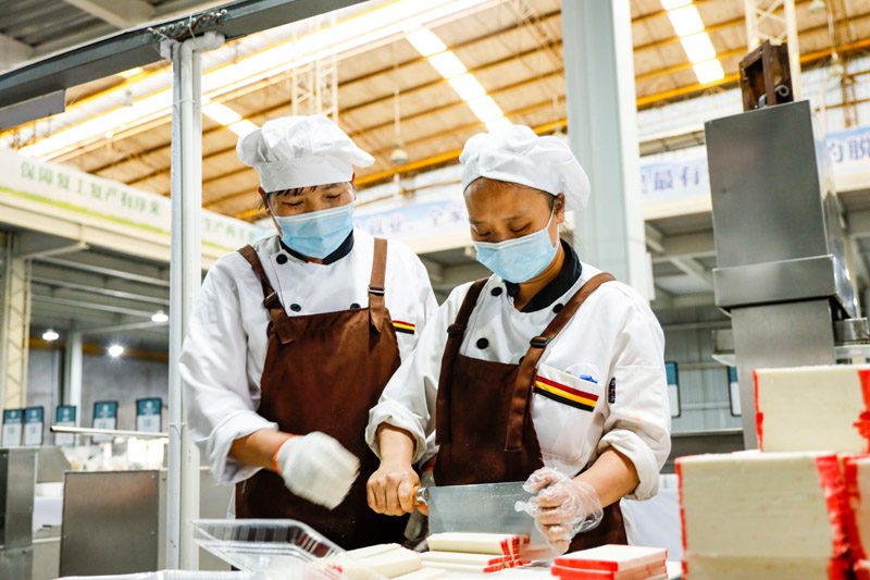 5月14日,在重慶市涪陵區美心紅酒小鎮景區扶貧車(chē)間里,一名技師手把手地指導貧困戶(hù)李曉紅(右)加工食品。為助力脫貧攻堅,美心紅酒小鎮景區結合自身旅游人氣優(yōu)勢,將閑置廠(chǎng)房改造成扶貧車(chē)間。扶貧車(chē)間在采買(mǎi)貧困戶(hù)和周邊村民榨菜、土豆等農副產(chǎn)品進(jìn)行消費扶貧的同時(shí),還優(yōu)先招收困難群眾、貧困戶(hù)進(jìn)入車(chē)間從事食品加工生產(chǎn)工作,帶動(dòng)景區周邊100余戶(hù)貧困戶(hù)和困難群眾家庭實(shí)現增收。新華社記者 劉潺 攝