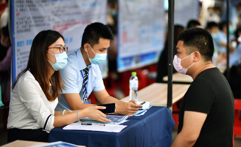 4月18日,在??谑信e行的“戰疫情·促就業(yè)”大型綜合性招聘會(huì )上,用人單位與求職者現場(chǎng)交流。在做好疫情防控工作的前提下,此次招聘會(huì )邀請了100多家企業(yè)參加,提供就業(yè)崗位4000個(gè)。新華社記者 郭程 攝