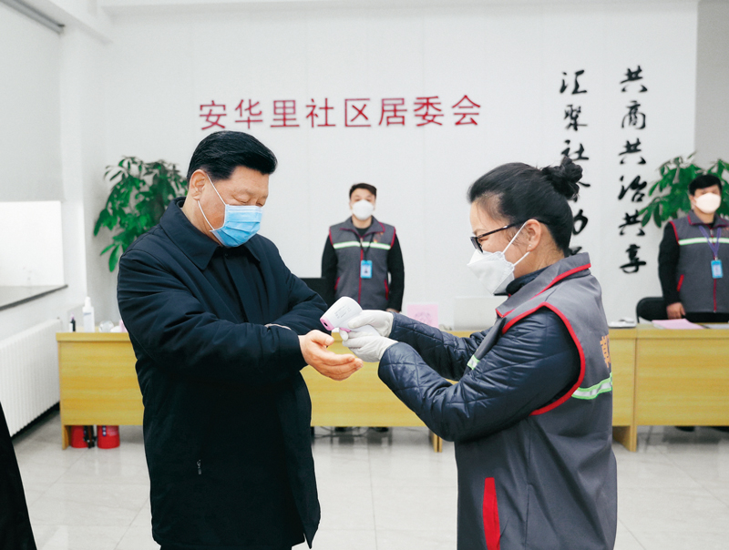 2020年2月10日,中共中央總書(shū)記、國家主席、中央軍委主席習近平在北京調研指導新冠肺炎疫情防控工作。這是習近平來(lái)到朝陽(yáng)區安貞街道安華里社區,了解基層一線(xiàn)疫情聯(lián)防聯(lián)控情況。 新華社記者 鞠鵬/攝